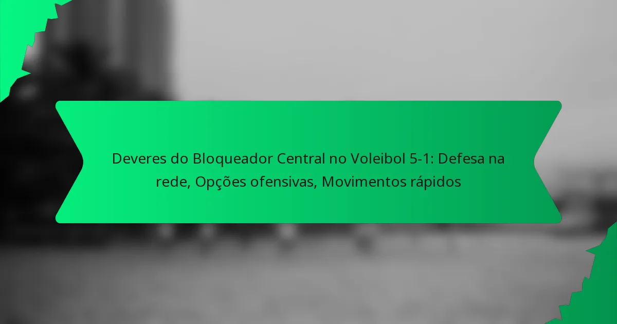 Os principais deveres de um bloqueador central no voleibol 5-1 incluem defesa na rede, pontuação ofensiva e movimentos rápidos. Esta posição é crucial tanto para parar os ataques adversários como para contribuir para as estratégias ofensivas da equipa.